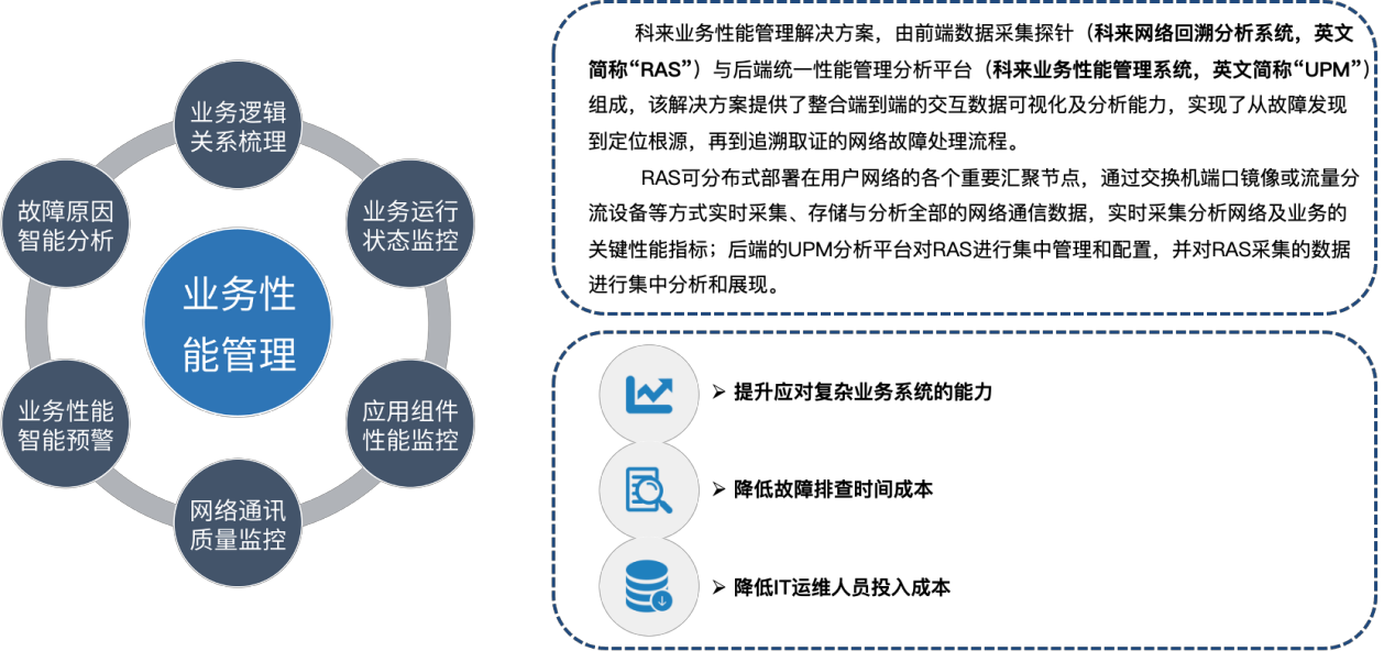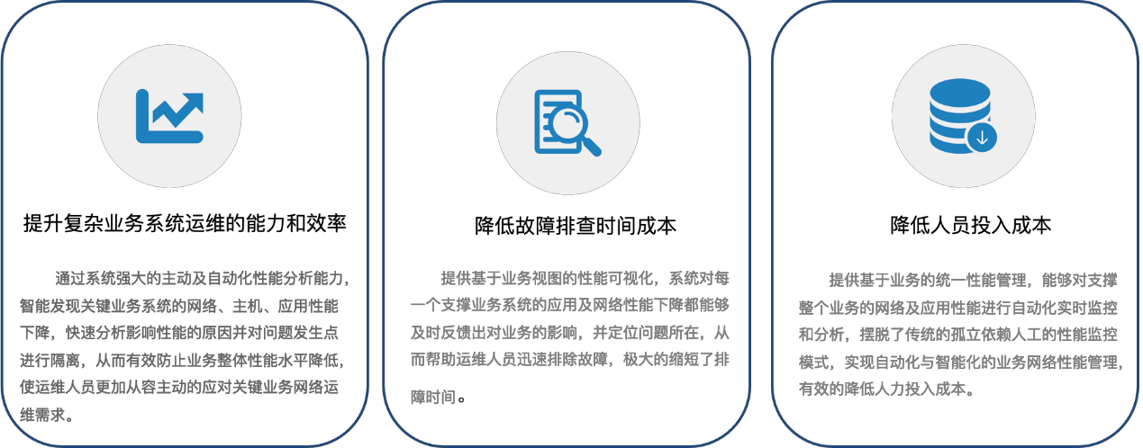 提供基于业务的统一性能管理,能够对支撑整个业务的网络及应用性能进行自动化实时监控和分析,摆脱了传统的孤立依赖人工的性能监控模式,实现自动化与智能化的业务网络性能管理,有效的降低人力投入成本。