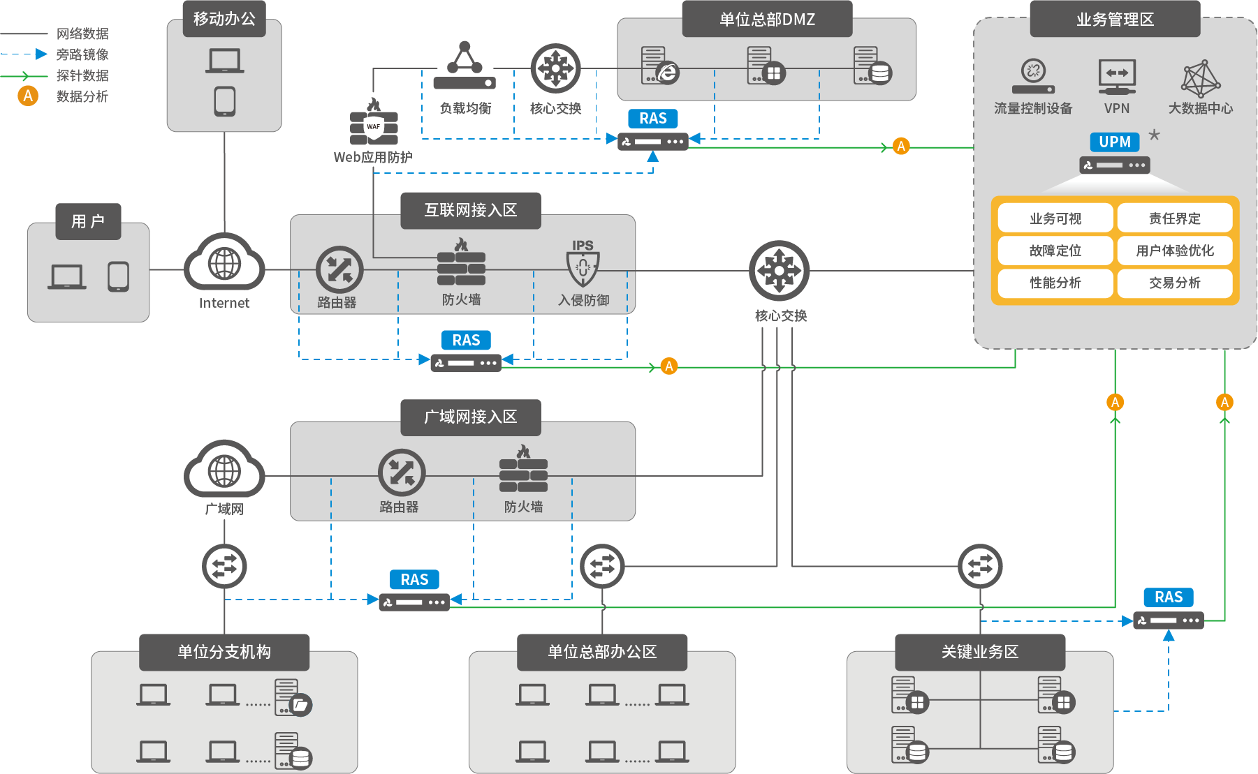 同时,RAS还可实时捕获并保存网络通讯流量,具备对长期网络通讯数据进行快速数据挖掘和回溯分析能力。实现对关键业务系统中的网络异常、应用性能异常和网络行为异常的秒级发现,以及区分异常原因的智能回溯分析,提升了对关键业务系统的运行保障能力和问题处置效率。