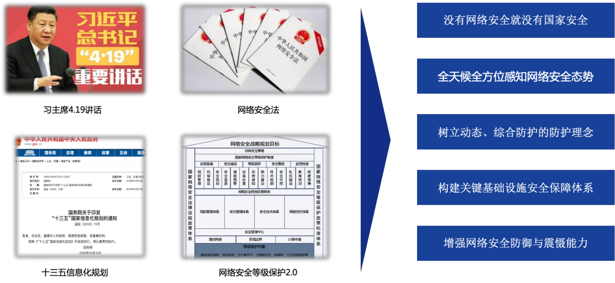 从政策层面来看,国家是非常重视网络安全,习主席在4.19网络安全座谈会上提到没有网络安全,就没有国家安全,网络安全具有很强的隐蔽性,一个技术漏洞、安全风险可能隐藏几年都发现不了,结果是“谁进来了不知道、是敌是友不知道、干了什么不知道”,