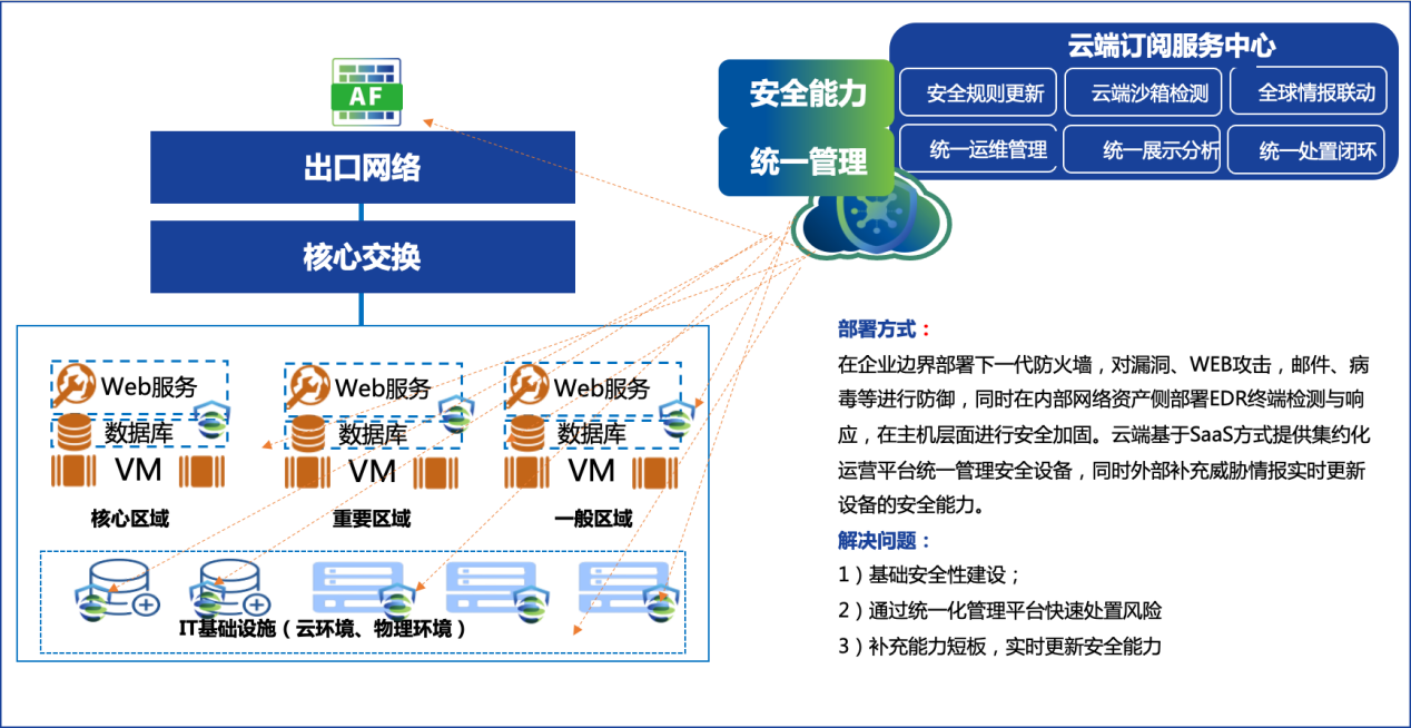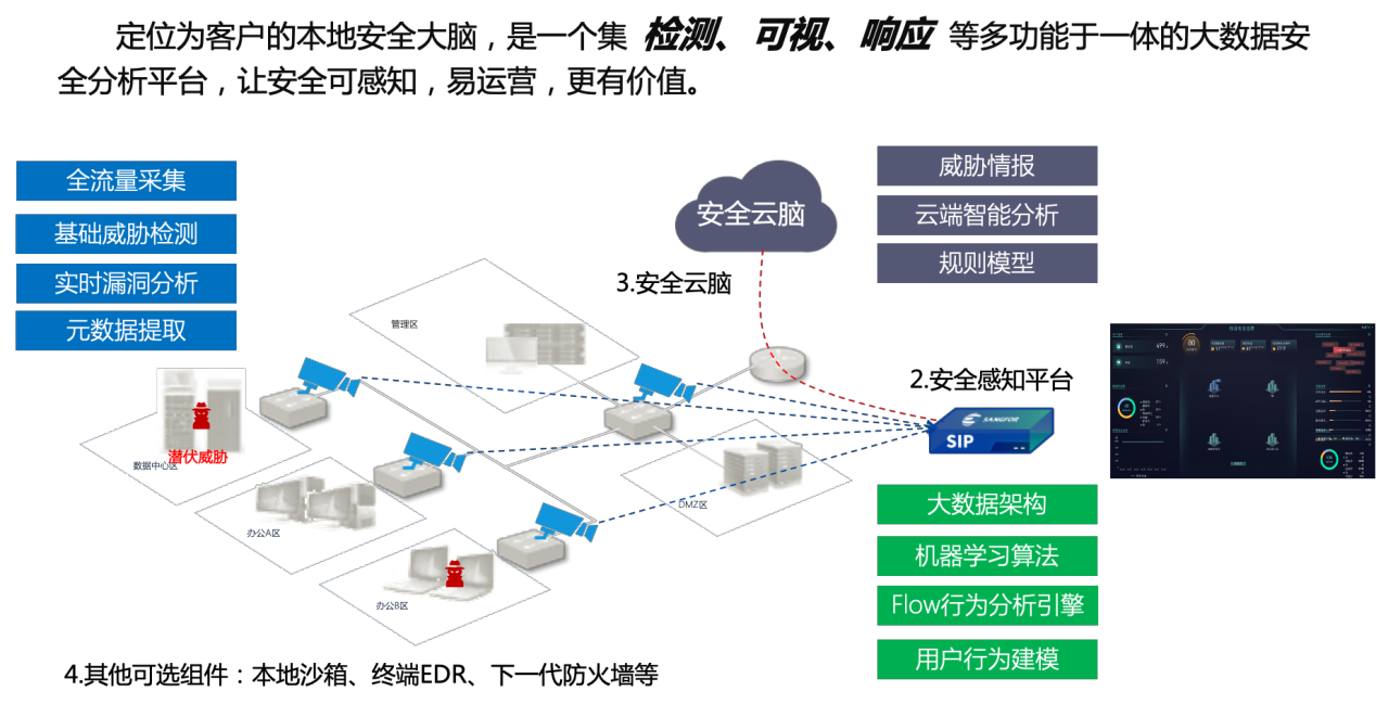 “云端”:在安全人员运营的过程中,安全能力始终是最核心的要素,构建云端安全大脑,迅速定位本地设备网络和终端无法识别到的威胁。