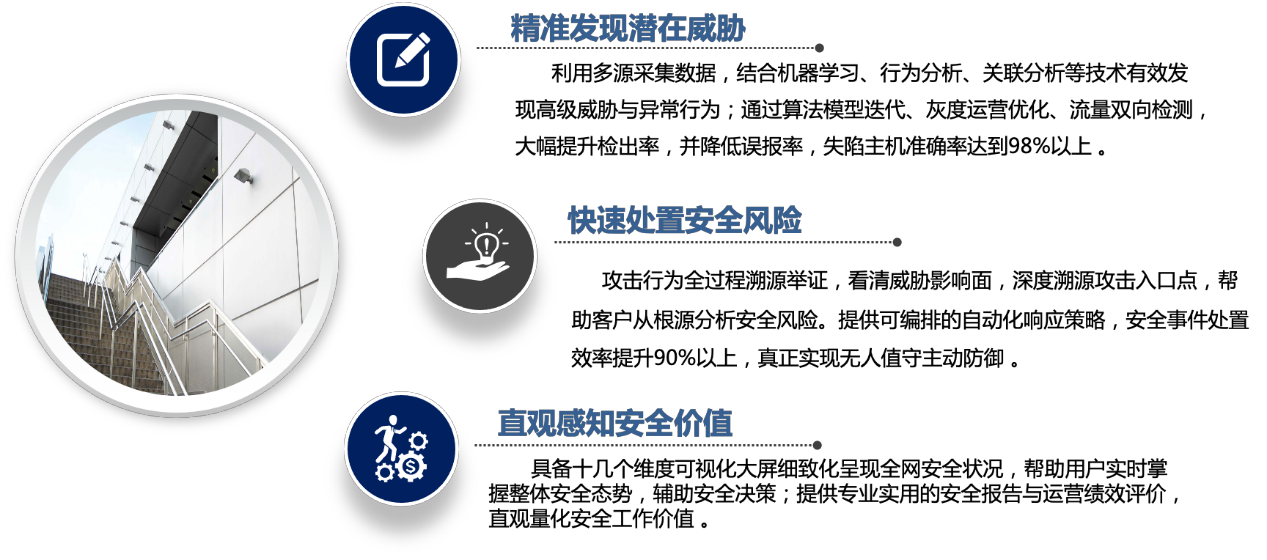 基于强大的流量、日志采集和大数据分析检测技术,发现现网中的高级威胁攻击,帮助客户实时快速发现网络中的安全威胁事件。
