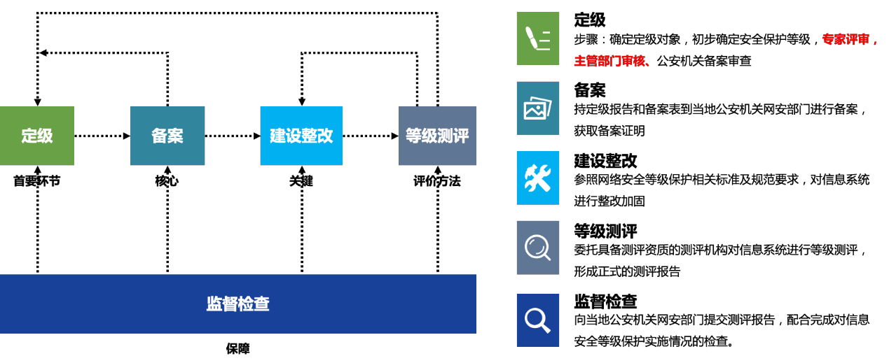 网络安全等级保护工作包括定级、备案、建设整改、等级测评、监督检查五个流程。在等级保护全流程中,涉及到四个不同的角色,分别是:运营和使用单位、公安机关、时迅迪科技、测评机构。