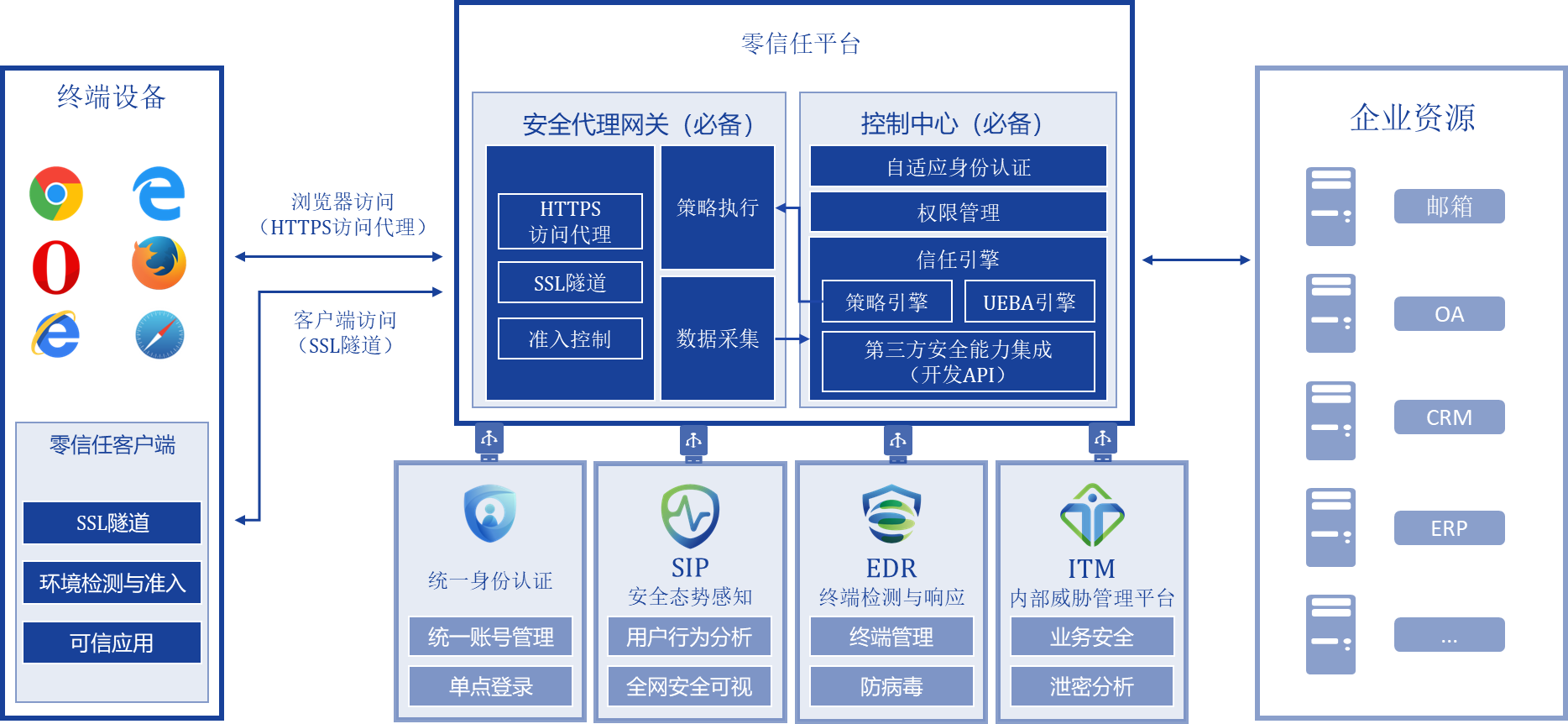 时迅迪提供的零信任安全架构是基于零信任理念构建的新一代安全解决方案。控制中心为统一控制大脑,实现用户认证、用户授权、多源信任评估、动态访问控制策略等。以身份为中心,构建可信访问、智能权限、极简运维的零信任安全架构。