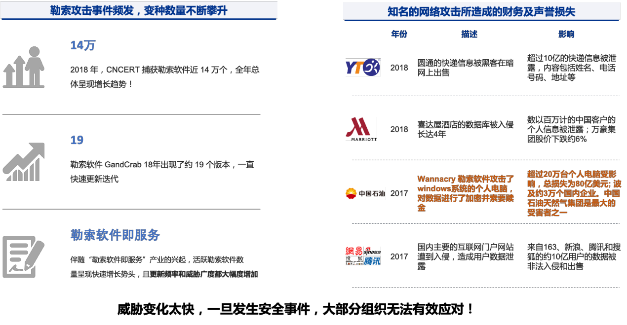 在开展安全建设工作的过程中,我们看到很多客户面对当下的威胁,存在防御能力的不足。我们可以看一下从上世纪90年代到现在为止,威胁持续进化的过程,从传统的恶意代码,如今已经演变成针对特定的目标对象开展高级的持续性攻击,以及近几年来势汹汹的勒索病毒,网络攻击呈现出对抗强、干扰多、线索散等诸多特点,而传统的技术通常无法有效防御上述威胁。