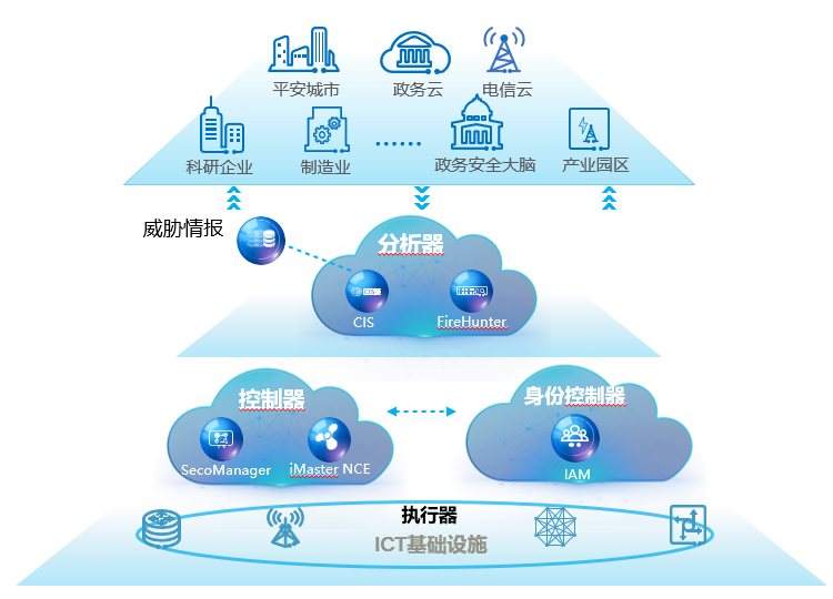 相当于“中枢神经”,以华为SecoManager安全控制器为核心组件。该组件定位于面向多租户的全生命周期安全策略管理、业务编排。可以获取SDN控制器拓扑和资源管理输入,结合分析器的智能检测结果,以及从采集器中收集的数据,对执行器进行业务管理和策略优化