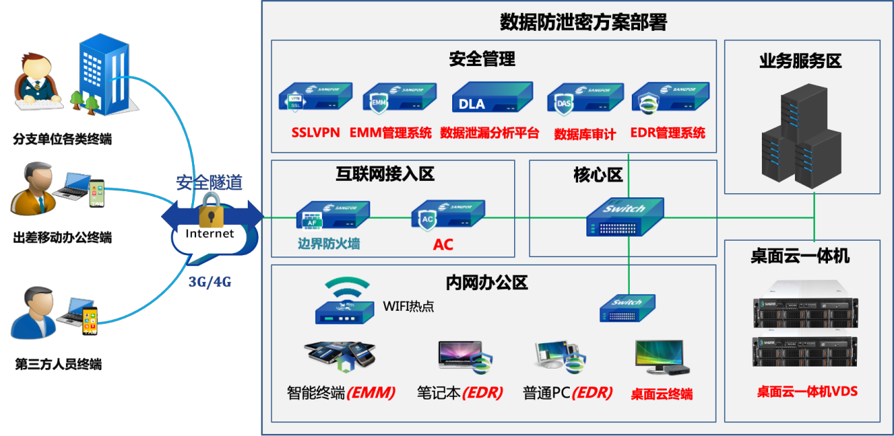 通过在互联网接入区部署AC数据防泄密网关,实现网络边界数据防泄密控制。在安全管理区部署VPN、数据泄露分析平台、数据库审计和EMM、EDR管理端,实现远程和本地用户接入身份认证和加密传输、数据防泄密综合分析与可视、数据库安全审计等功能。